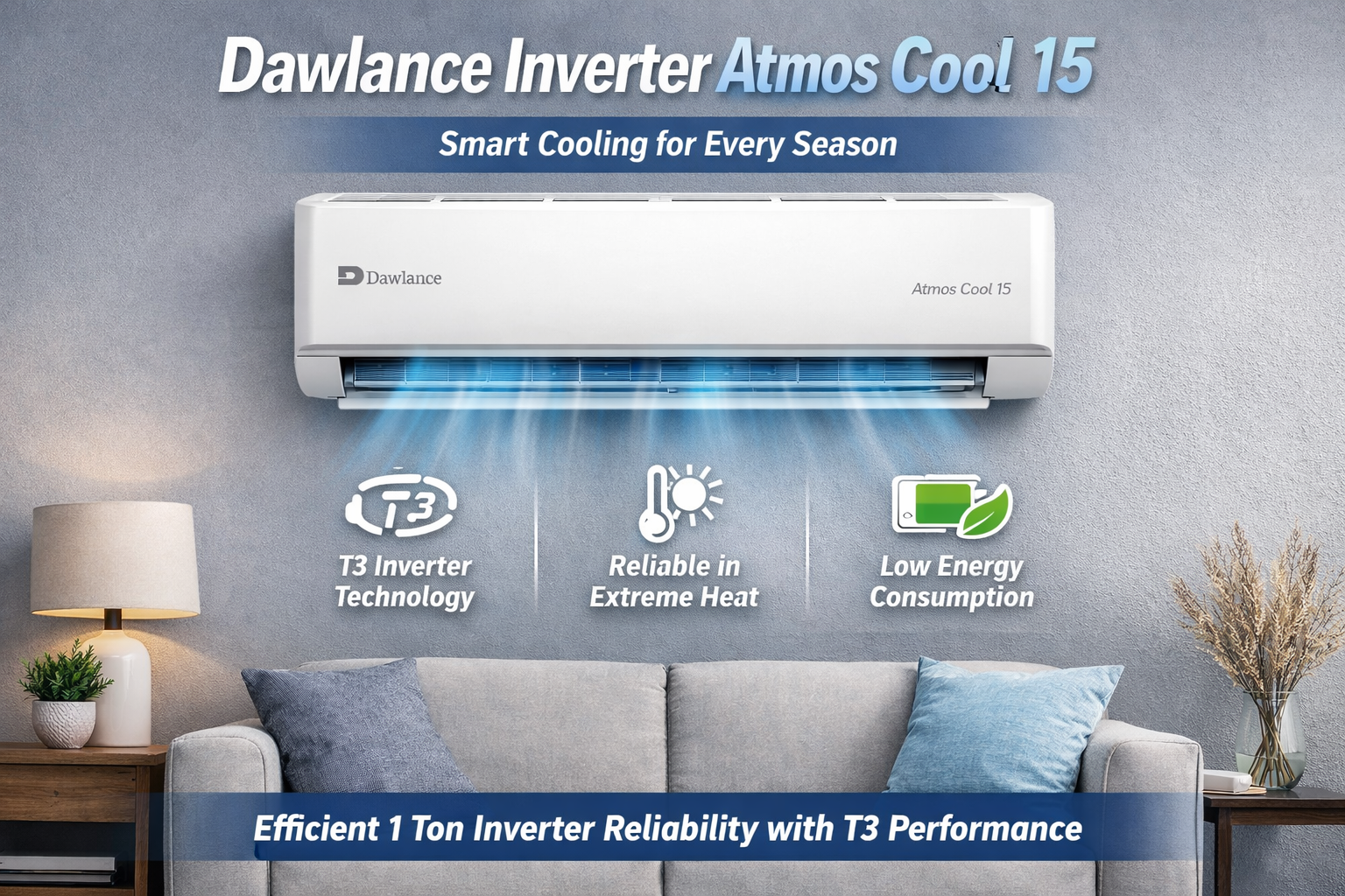 The Dawlance Inverter Atmos Cool 15 delivers powerful, energy-efficient cooling with T3 inverter technology, ensuring comfort, durability, and savings even in extreme heat.