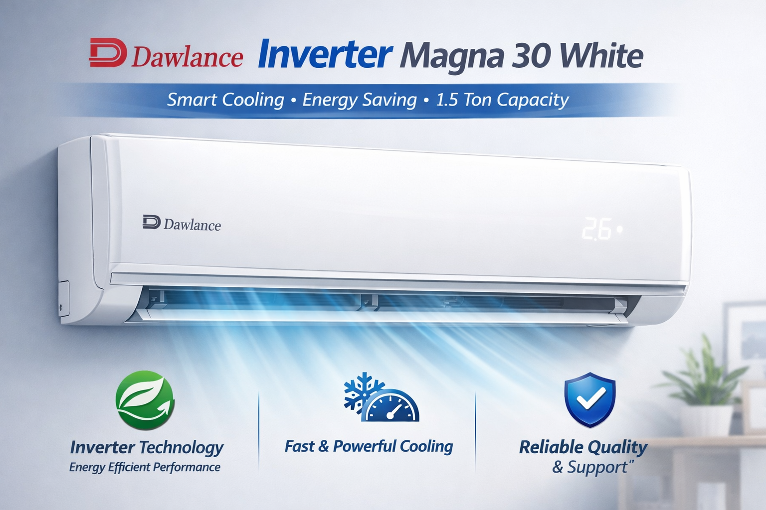 Experience reliable comfort with the Dawlance Inverter Magna 30 White, designed to deliver fast, consistent cooling even in extreme heat. Its advanced inverter technology optimizes power usage, reducing electricity bills while maintaining ideal room temperature. The elegant white finish blends seamlessly into modern interiors, making it a perfect choice for homes that value both performance and style.