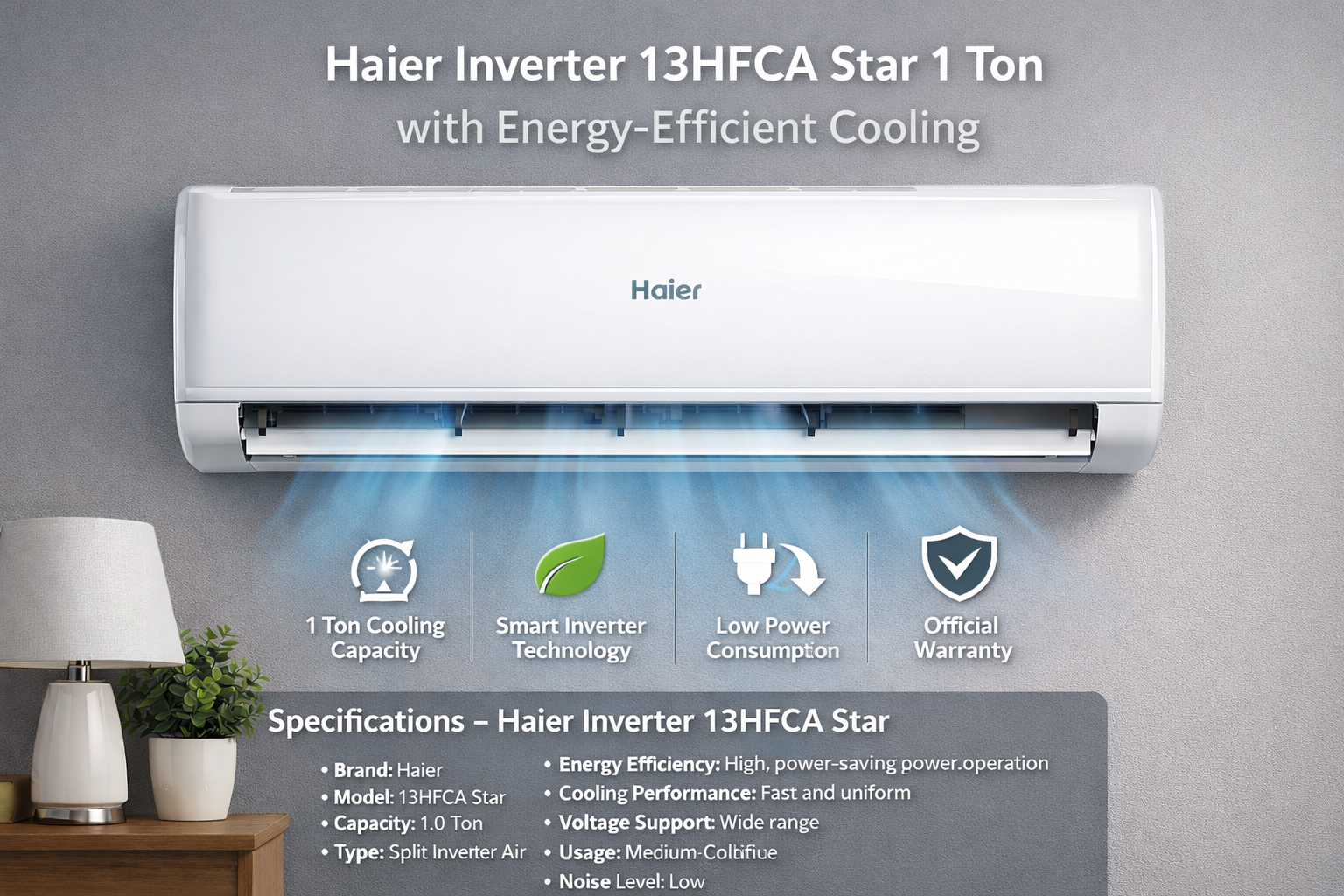 Built with advanced inverter technology, the Haier 13HFCA Star reduces electricity bills without compromising performance. Stable operation during voltage fluctuations ensures uninterrupted cooling, while smooth airflow reaches every corner of the room. Quiet performance makes it ideal for bedrooms, lounges, and workspaces.
