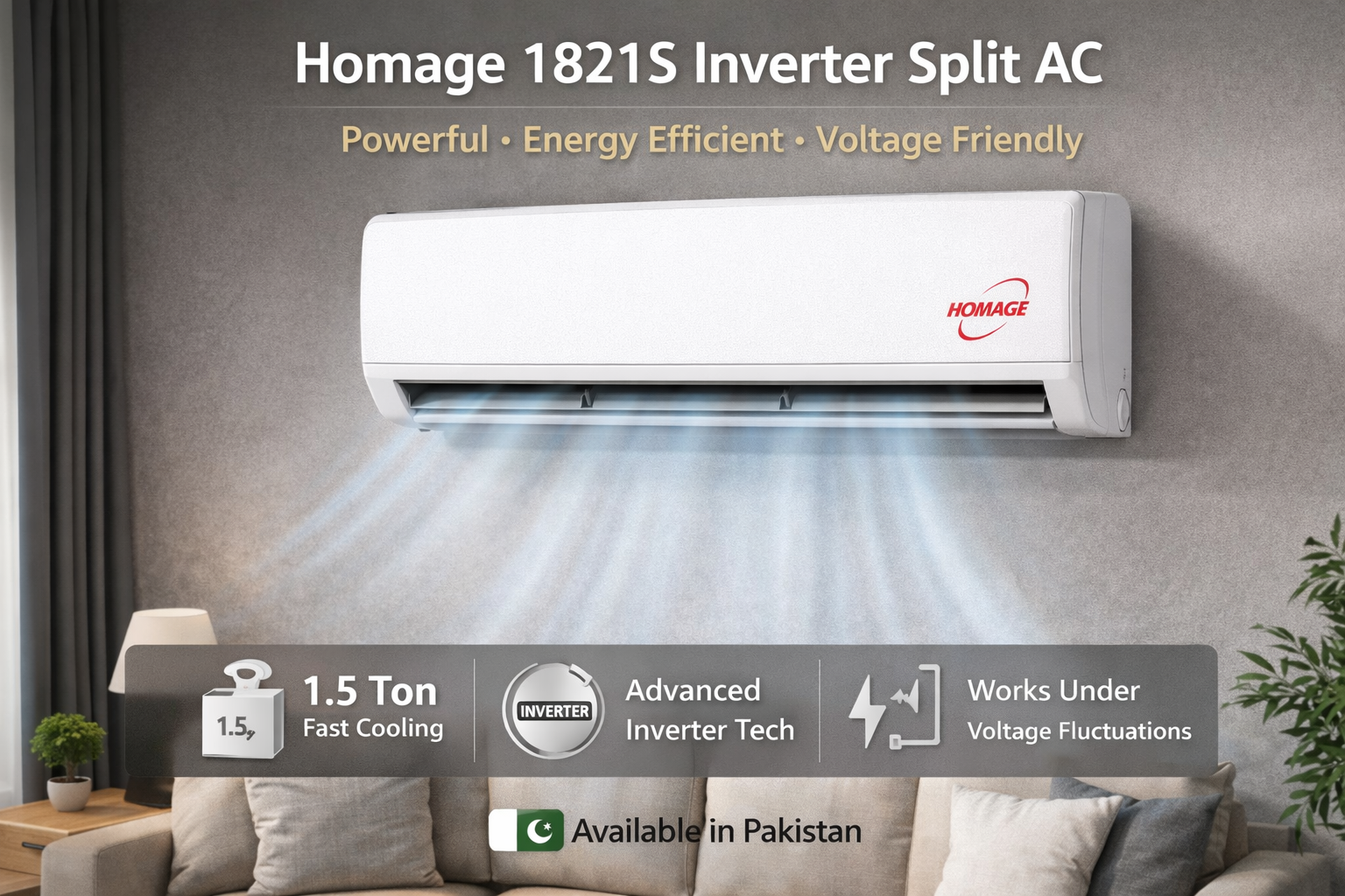 A 1.5 ton Homage inverter split AC offering powerful cooling, energy efficiency, and reliable performance for Pakistani homes.