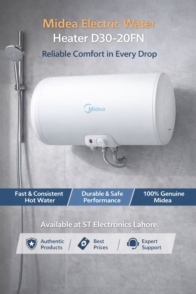 When you choose the Midea Electric Water Heater D30-20FN from ST Electronics, you get genuine products at competitive prices with full manufacturer warranty support. Benefit from professional installation guidance, reliable after-sales service, and trusted customer care in Lahore. Stay warm, safe, and confident with every installation.